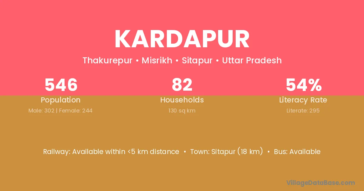 Sitapur (18 km) is the nearest town to Kardapur village for major economic activities and is located approximately 18 km away.