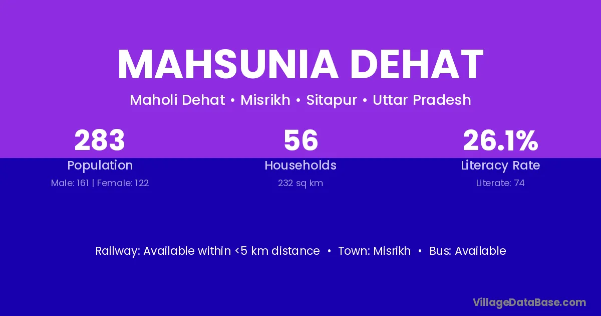 Mahsunia Dehat village has a total population of 283 people, of which 161 are males and 122 are females.