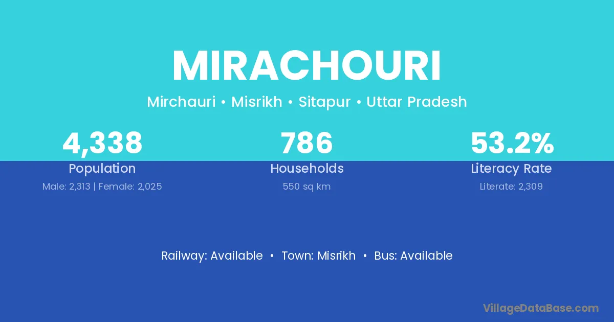 The literacy rate of Mirachouri village is 53.23%. Male literacy stands at 64.55% and female literacy at 40.30%.