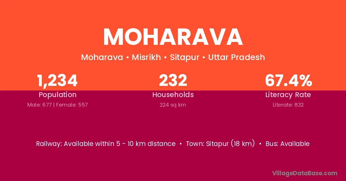 Sitapur (18 km) is the nearest town to Moharava village for major economic activities and is located approximately 18 km away.
