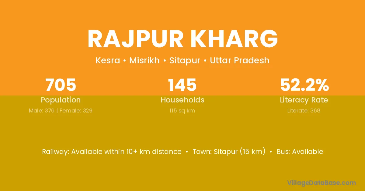 Sitapur (15 km) is the nearest town to Rajpur Kharg village for major economic activities and is located approximately 15 km away.