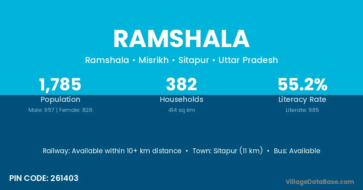 Sitapur (11 km) is the nearest town to Ramshala village for major economic activities and is located approximately 11 km away.
