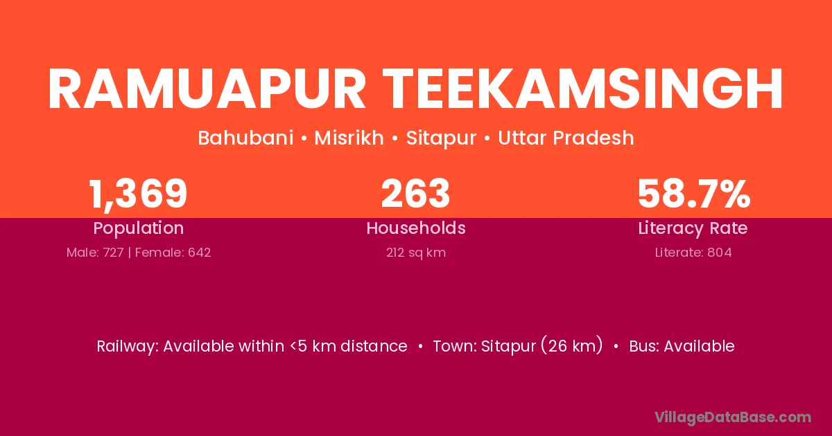 Ramuapur Teekamsingh village has a total population of 1,369 people, of which 727 are males and 642 are females.