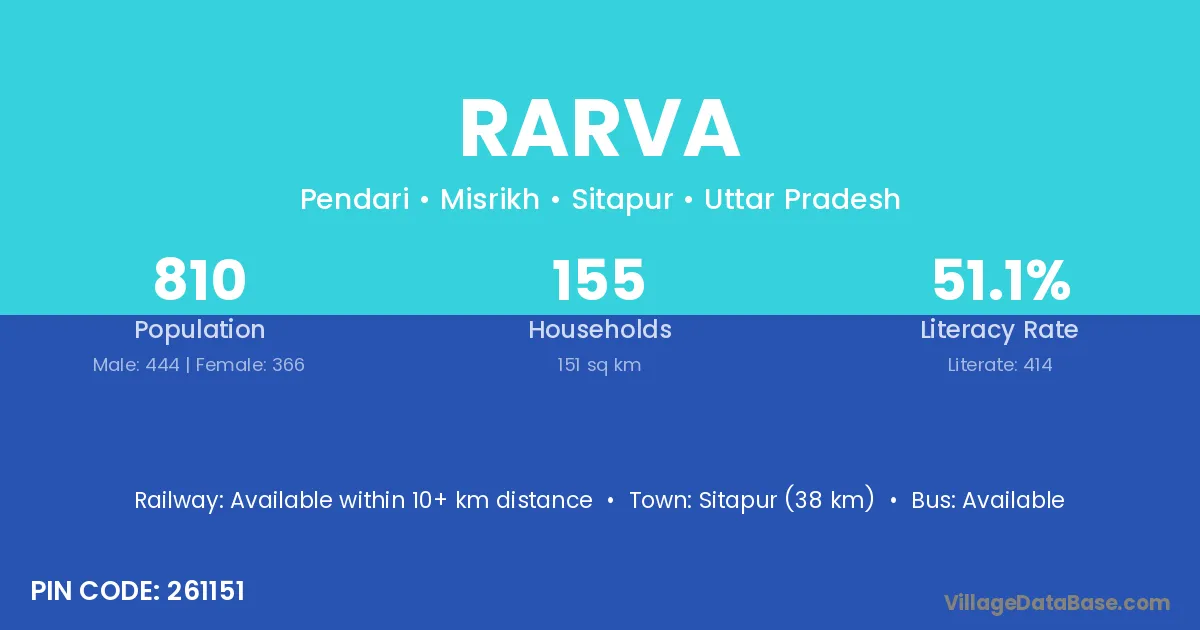 Sitapur (38 km) is the nearest town to Rarva village for major economic activities and is located approximately 38 km away.