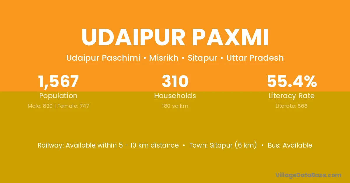 Sitapur (6 km) is the nearest town to Udaipur Paxmi village for major economic activities and is located approximately 6 km away.