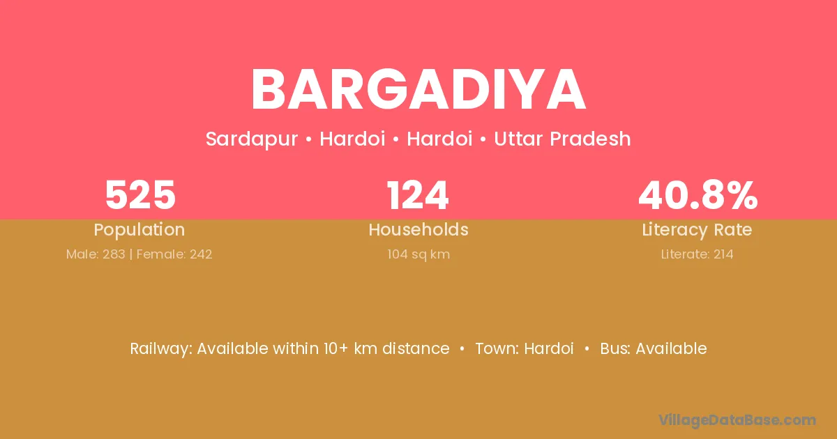 The literacy rate of Bargadiya village is 44.38%. Male literacy stands at 50.28% and female literacy at 38.10%.
