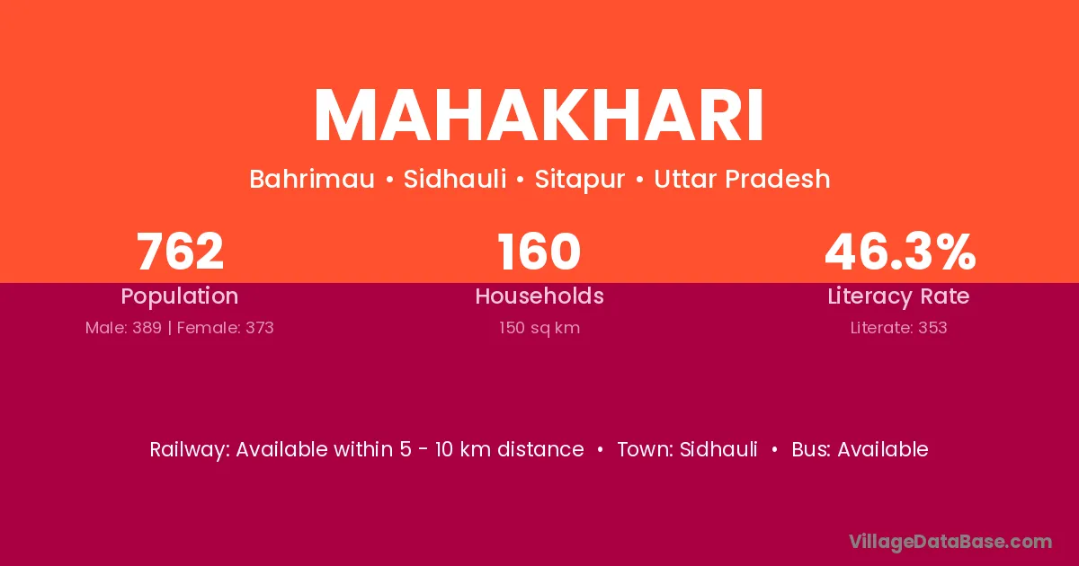 Mahakhari village has a total population of 762 people, of which 389 are males and 373 are females.