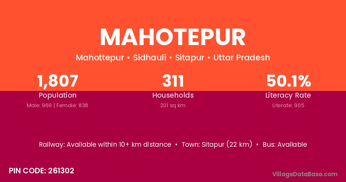 Sitapur (22 km) is the nearest town to Mahotepur village for major economic activities and is located approximately 22 km away.