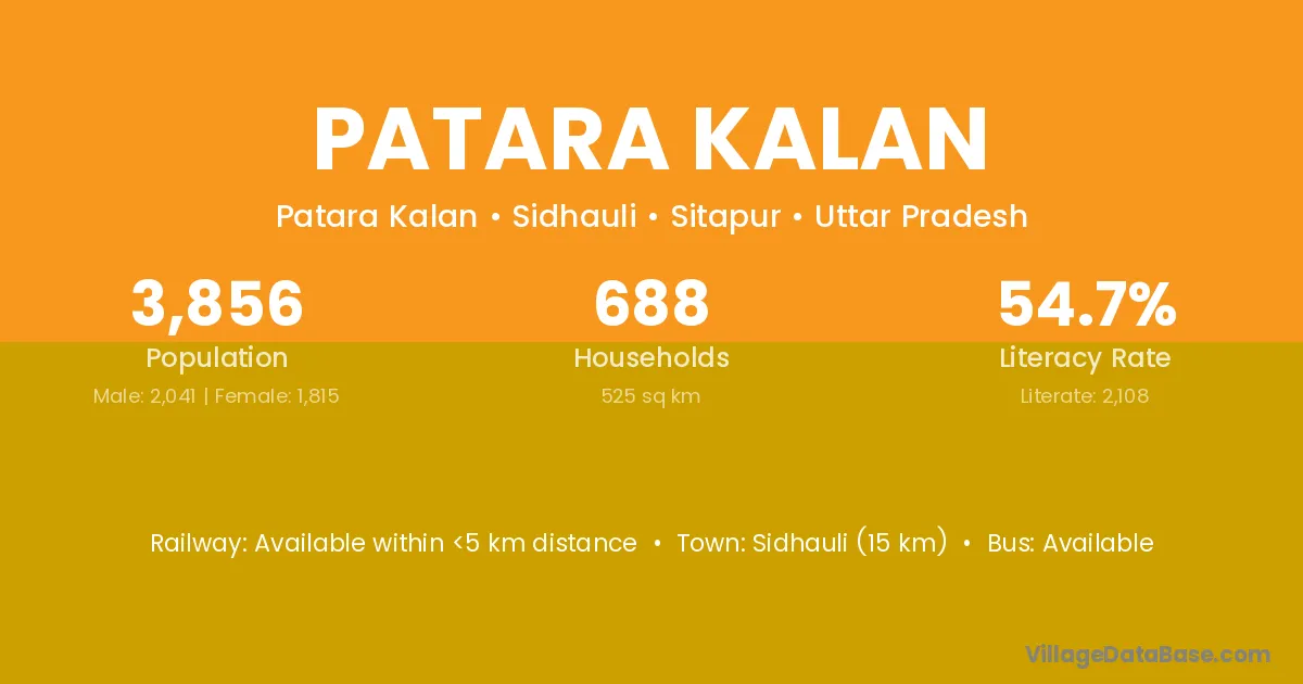 Patara Kalan village has a total population of 3,856 people, of which 2,041 are males and 1,815 are females.