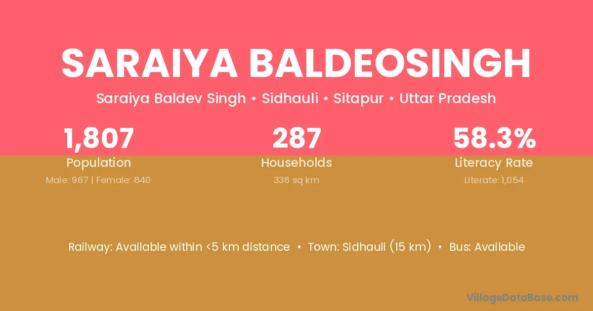 Saraiya Baldeosingh village has a total population of 1,807 people, of which 967 are males and 840 are females.