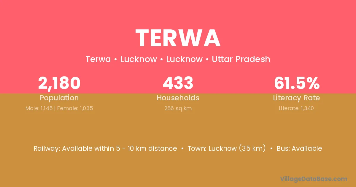 The literacy rate of Terwa village is 50.76%. Male literacy stands at 57.08% and female literacy at 43.10%.
