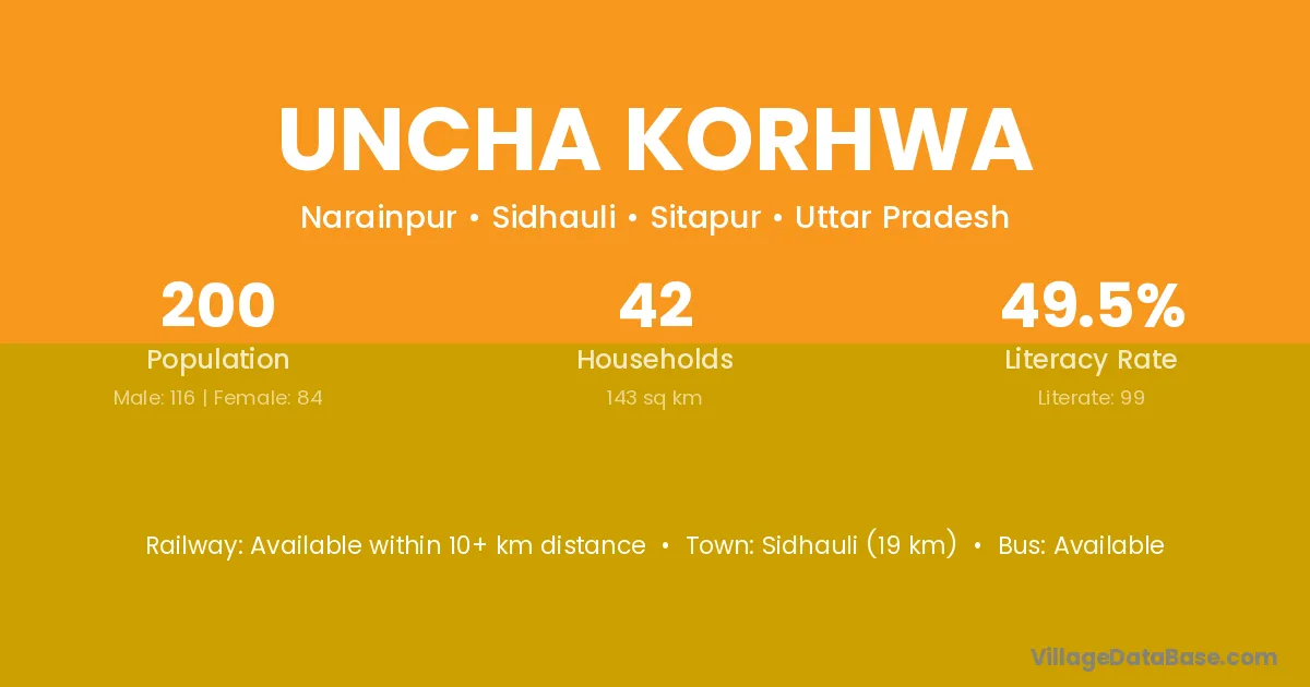 Uncha Korhwa village has a total population of 200 people, of which 116 are males and 84 are females.