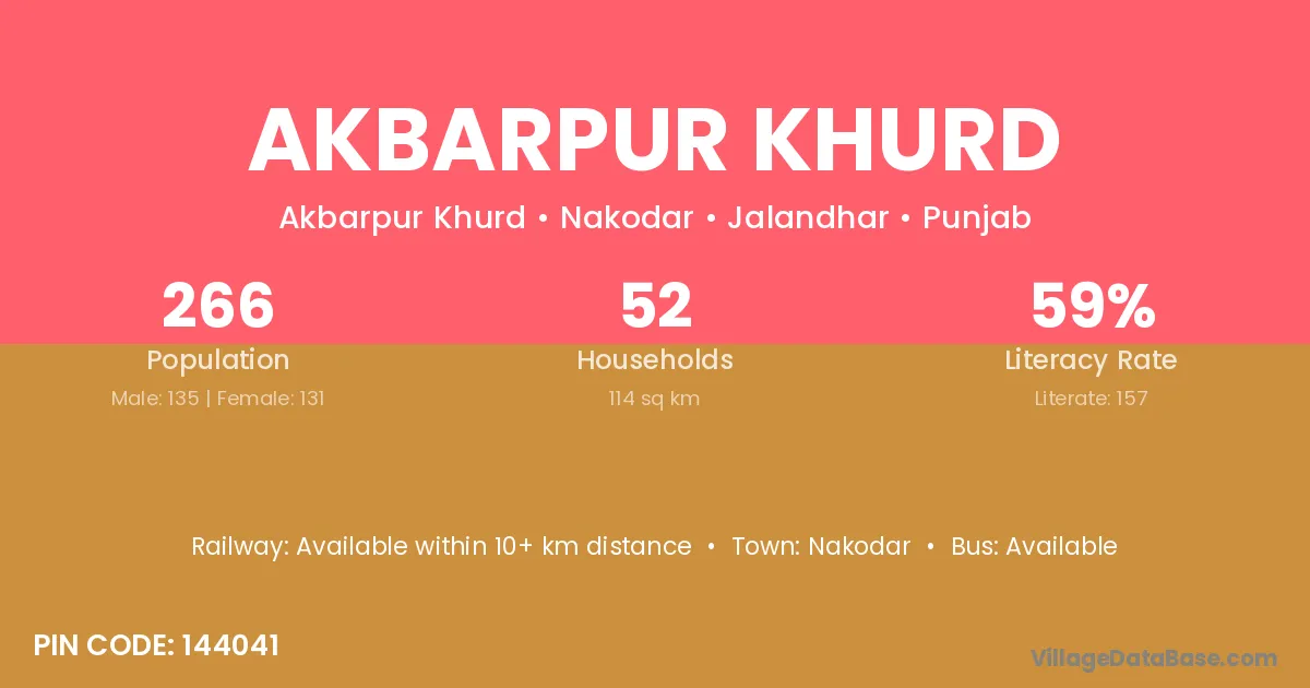 The literacy rate of Akbarpur Khurd village is 51.72%. Male literacy stands at 65.84% and female literacy at 35.51%.