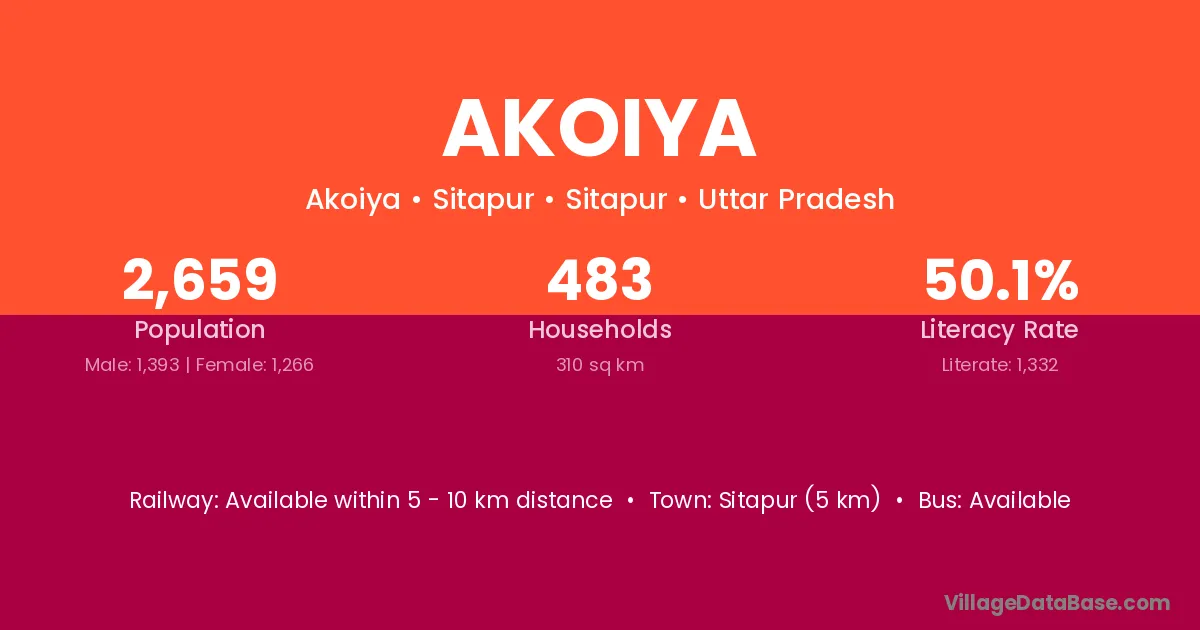 Sitapur (5 km) is the nearest town to Akoiya village for major economic activities and is located approximately 5 km away.