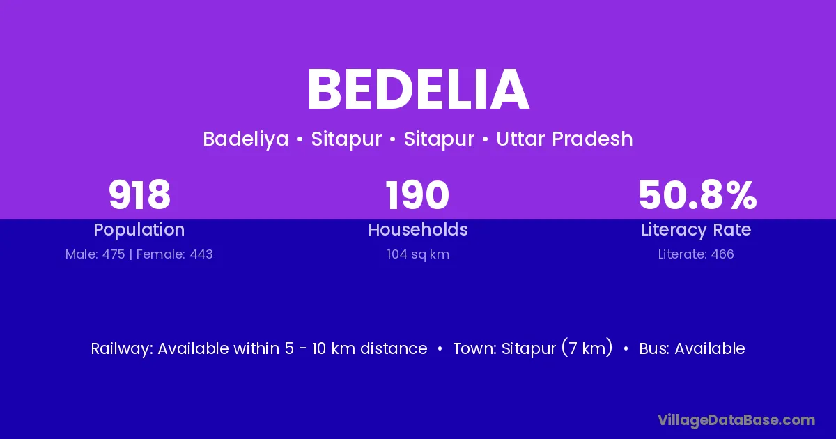 Sitapur (7 km) is the nearest town to Bedelia village for major economic activities and is located approximately 7 km away.