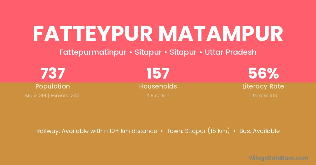 Sitapur (15 km) is the nearest town to Fatteypur Matampur village for major economic activities and is located approximately 15 km away.