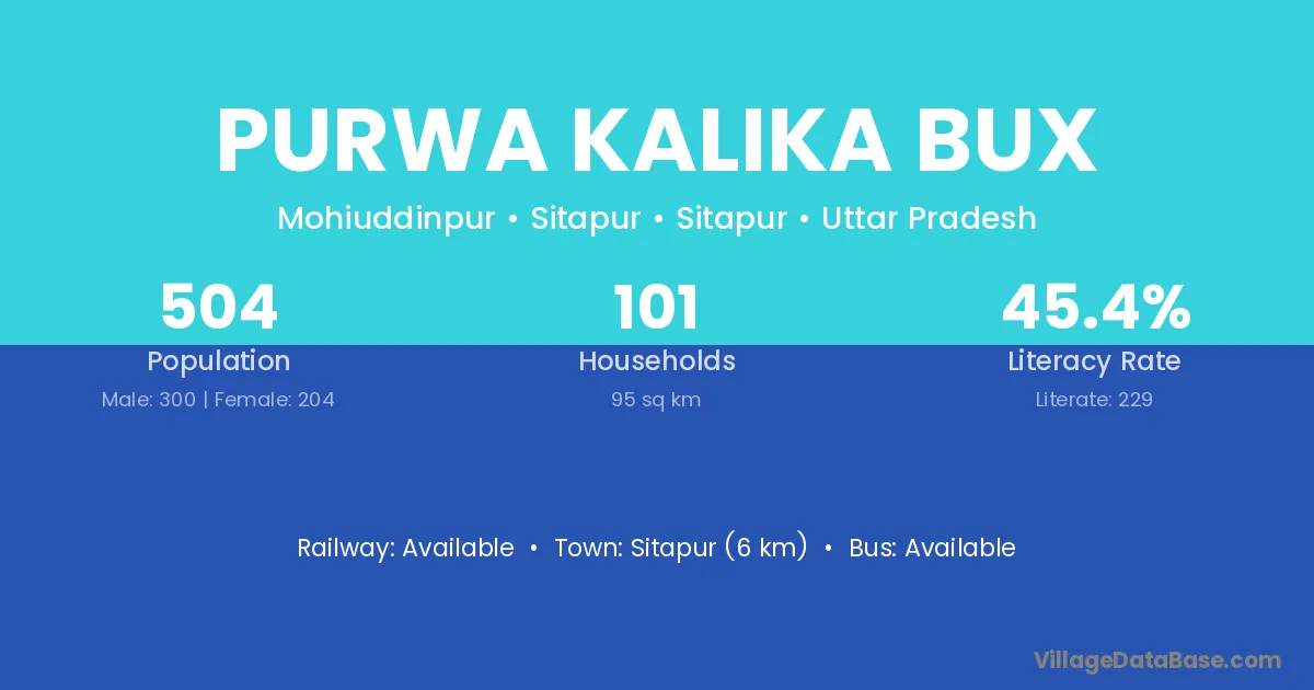 Purwa Kalika Bux village has a total population of 504 people, of which 300 are males and 204 are females.