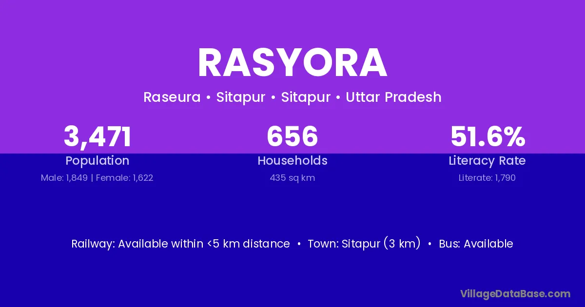 Sitapur (3 km) is the nearest town to Rasyora village for major economic activities and is located approximately 3 km away.