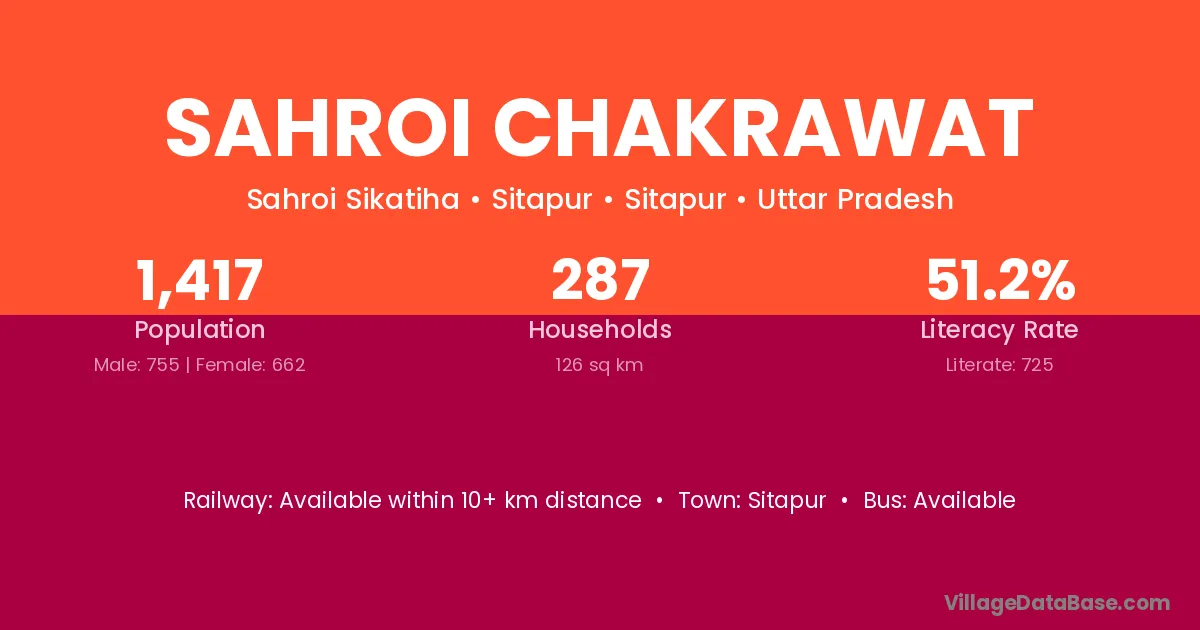 Sahroi Chakrawat village has a total population of 1,417 people, of which 755 are males and 662 are females.