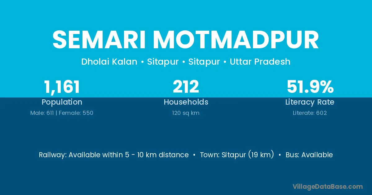 Sitapur (19 km) is the nearest town to Semari Motmadpur village for major economic activities and is located approximately 19 km away.