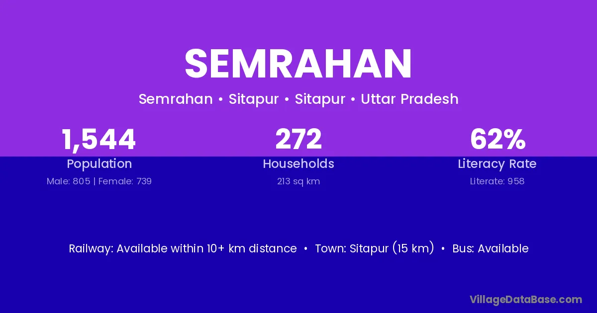 Sitapur (15 km) is the nearest town to Semrahan village for major economic activities and is located approximately 15 km away.