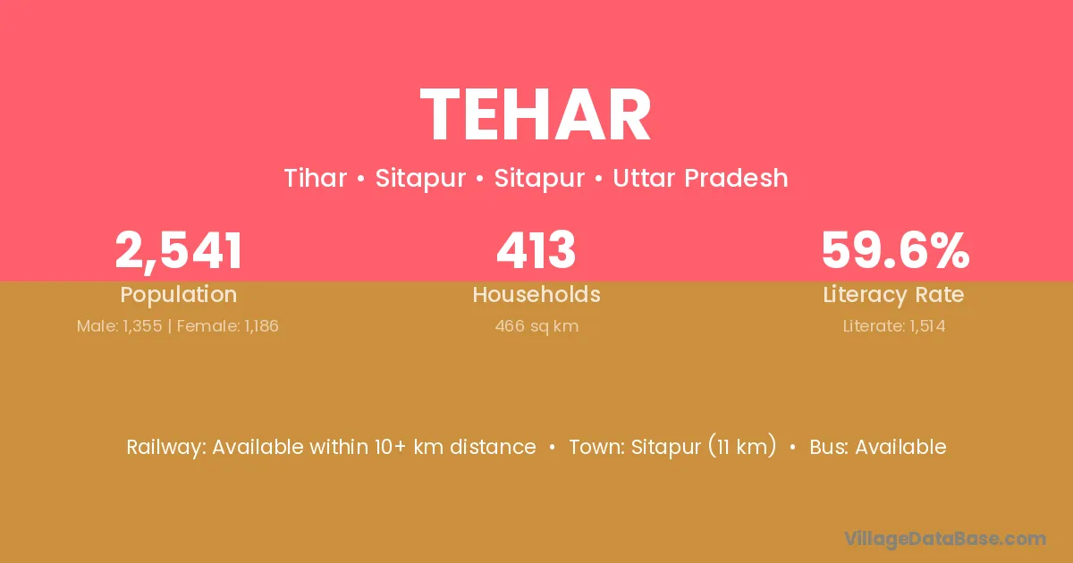 Sitapur (11 km) is the nearest town to Tehar village for major economic activities and is located approximately 11 km away.
