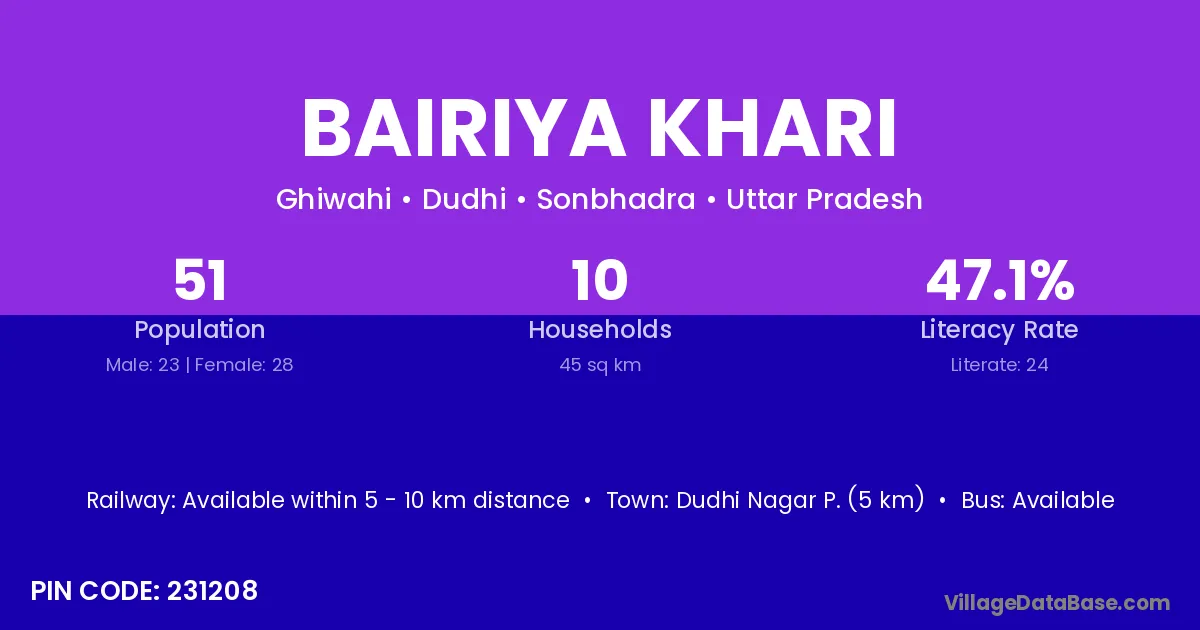 Bairiya Khari village has a total population of 51 people, of which 23 are males and 28 are females.