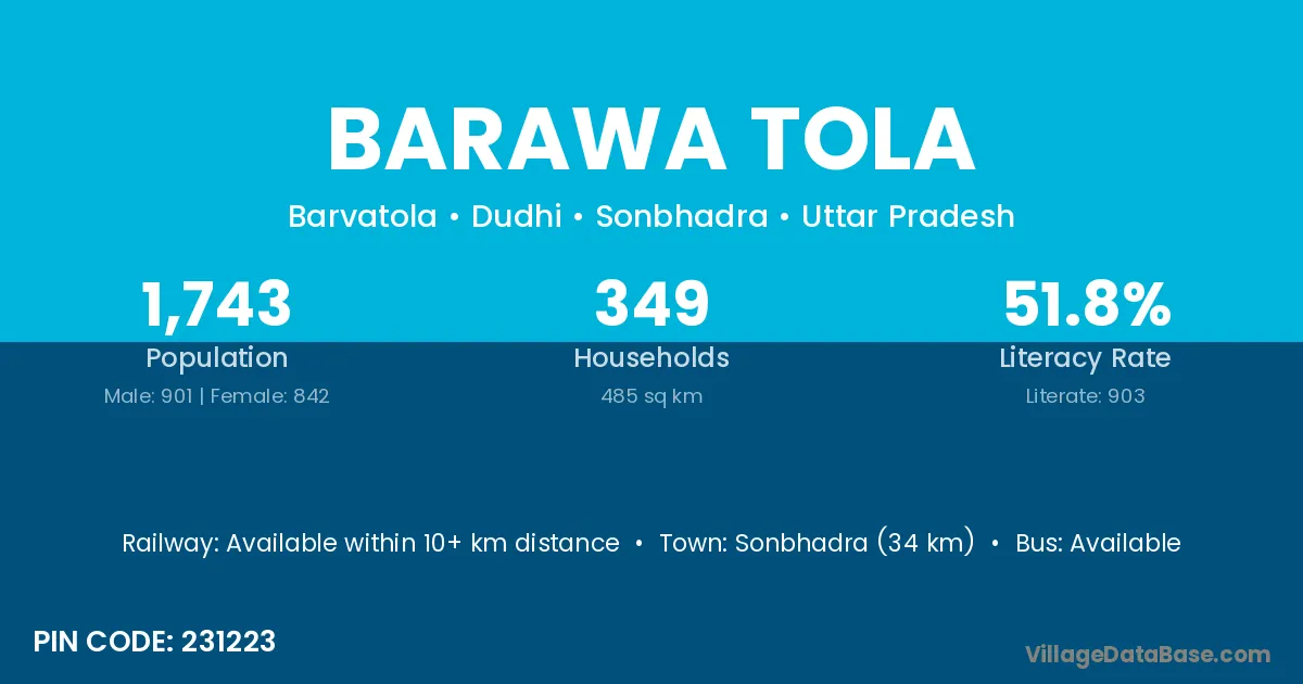 Sonbhadra (34 km) is the nearest town to Barawa Tola village for major economic activities and is located approximately 34 km away.