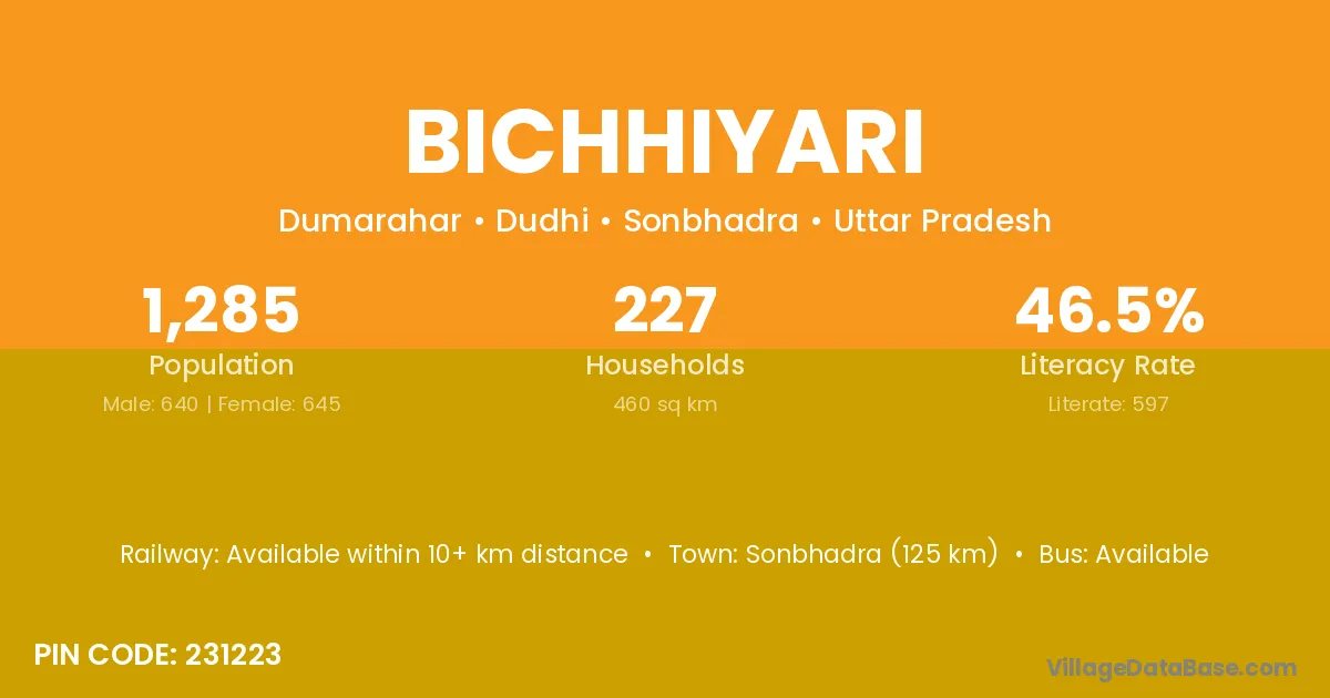 Bichhiyari village has a total population of 1,285 people, of which 640 are males and 645 are females.