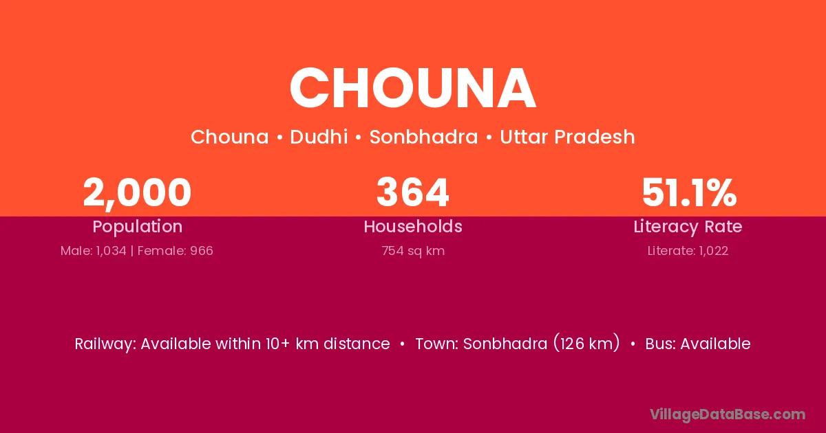 Sonbhadra (126 km) is the nearest town to Chouna village for major economic activities and is located approximately 126 km away.