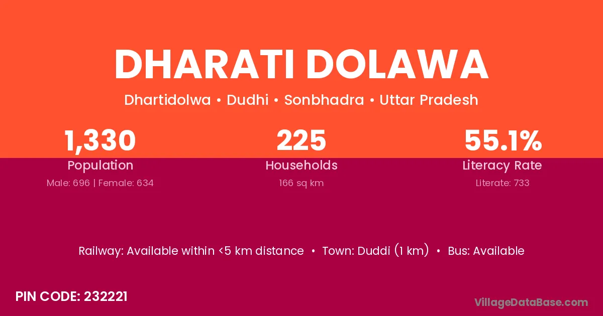 Duddi (1 km) is the nearest town to Dharati Dolawa village for major economic activities and is located approximately 1 km away.