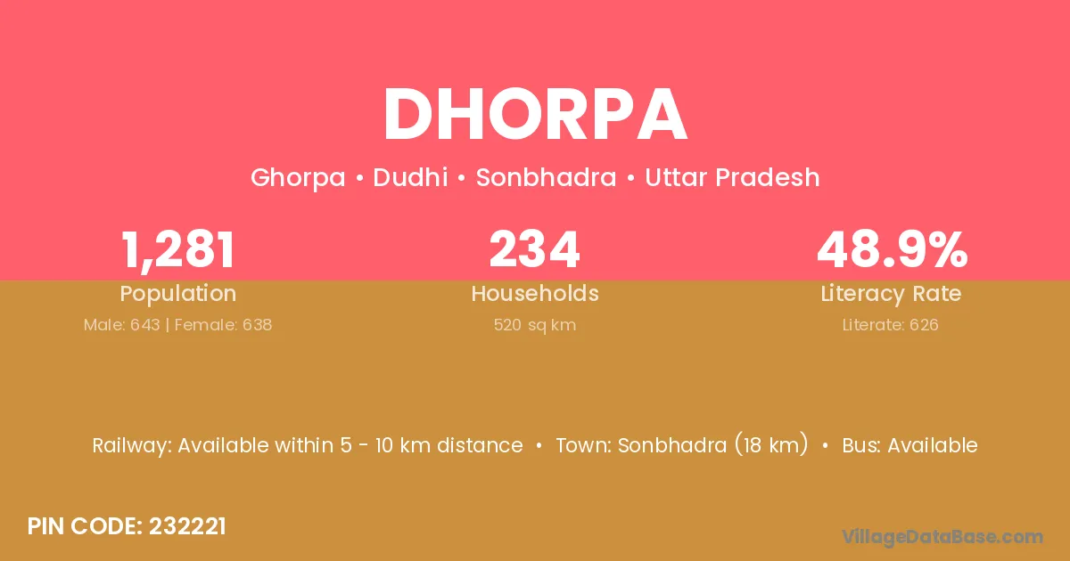 Sonbhadra (18 km) is the nearest town to Dhorpa village for major economic activities and is located approximately 18 km away.