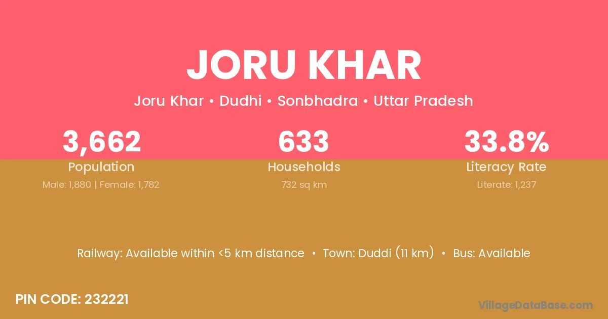 Duddi (11 km) is the nearest town to Joru Khar village for major economic activities and is located approximately 11 km away.