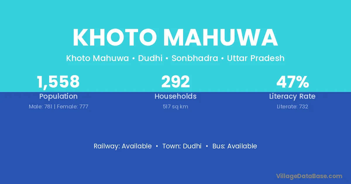 Khoto Mahuwa village has a total population of 1,558 people, of which 781 are males and 777 are females.