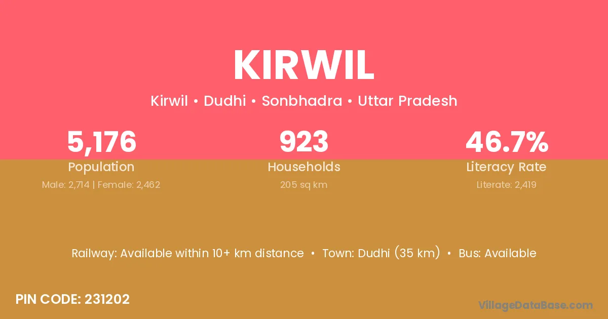 Dudhi (35 km) is the nearest town to Kirwil village for major economic activities and is located approximately 35 km away.