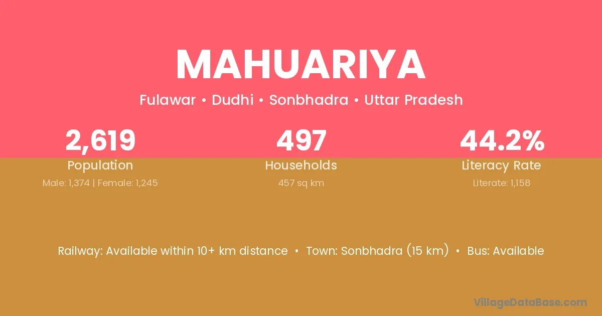 Sonbhadra (15 km) is the nearest town to Mahuariya village for major economic activities and is located approximately 15 km away.
