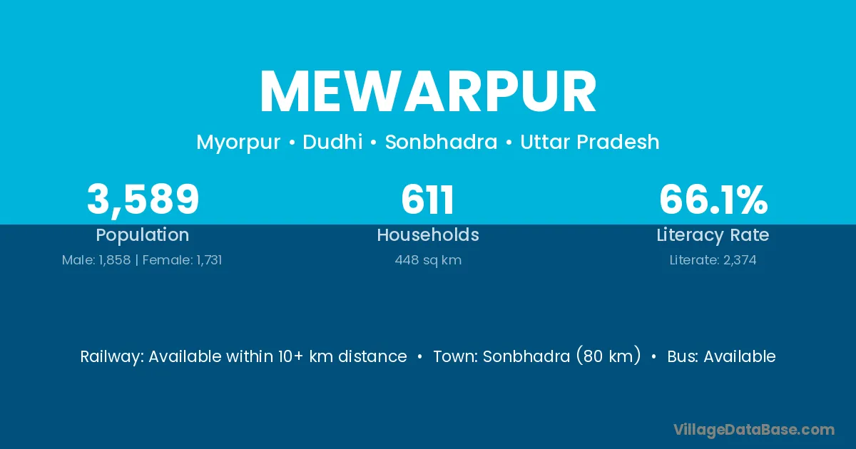 Sonbhadra (80 km) is the nearest town to Mewarpur village for major economic activities and is located approximately 80 km away.