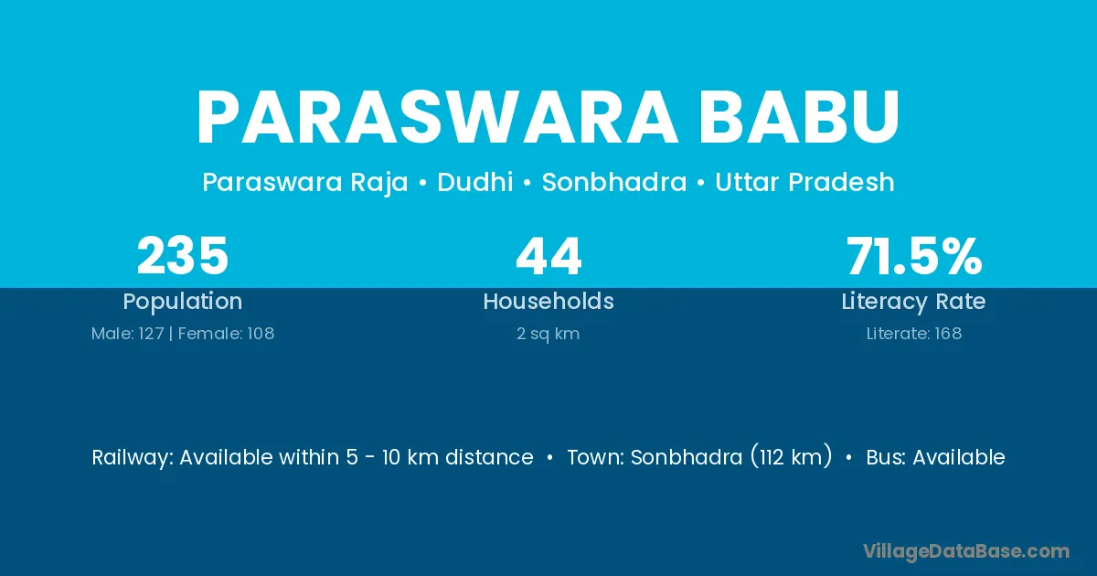 Sonbhadra (112 km) is the nearest town to Paraswara Babu village for major economic activities and is located approximately 112 km away.