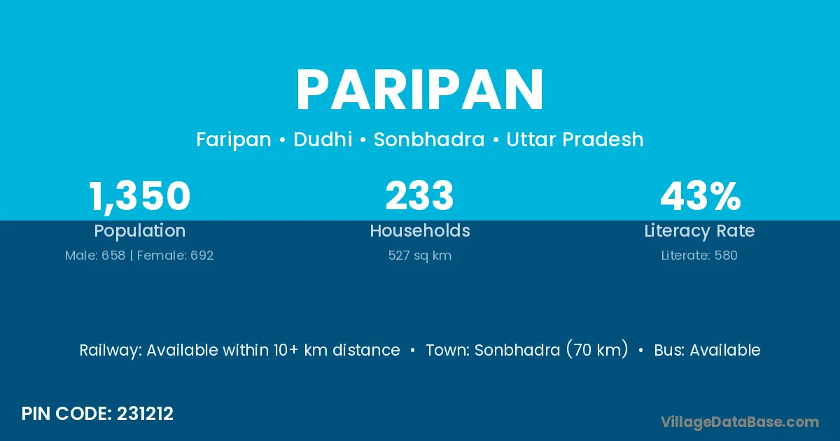 Sonbhadra (70 km) is the nearest town to Paripan village for major economic activities and is located approximately 70 km away.