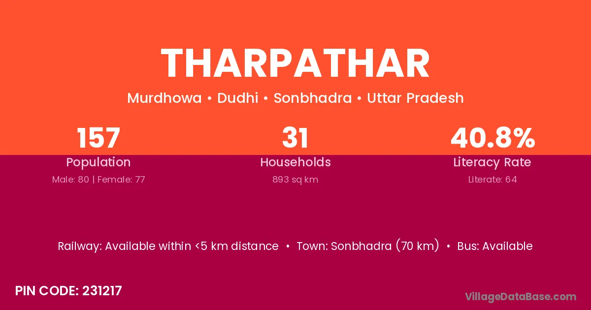 Sonbhadra (70 km) is the nearest town to Tharpathar village for major economic activities and is located approximately 70 km away.