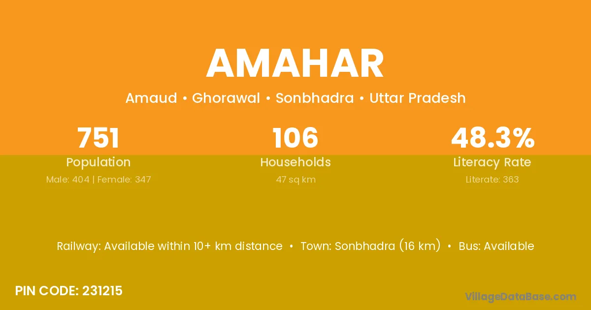 Sonbhadra (16 km) is the nearest town to Amahar village for major economic activities and is located approximately 16 km away.