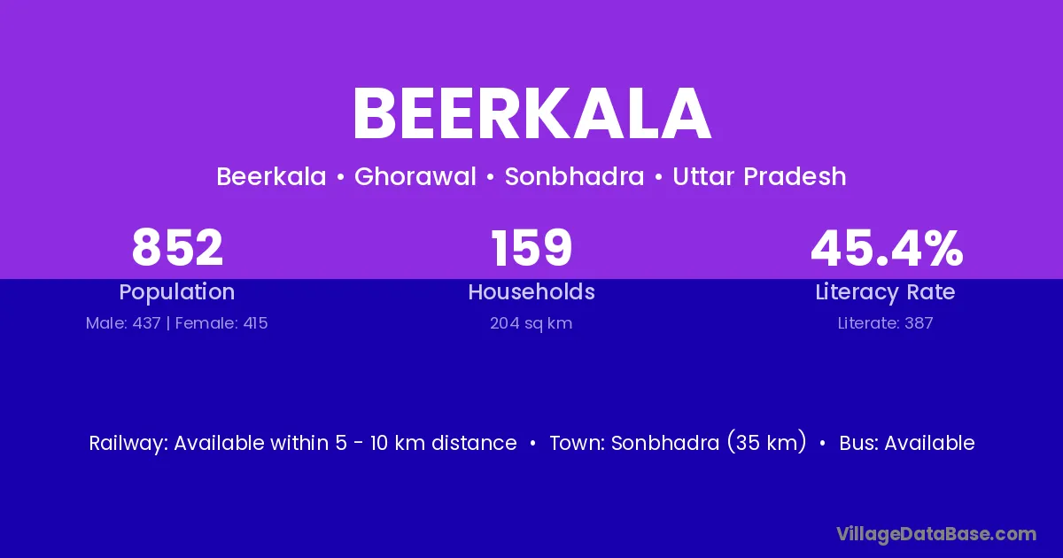 Sonbhadra (35 km) is the nearest town to Beerkala village for major economic activities and is located approximately 35 km away.