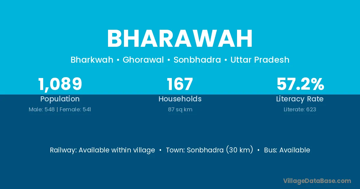 Sonbhadra (30 km) is the nearest town to Bharawah village for major economic activities and is located approximately 30 km away.