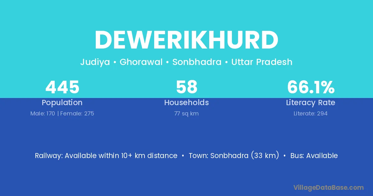 Sonbhadra (33 km) is the nearest town to Dewerikhurd village for major economic activities and is located approximately 33 km away.