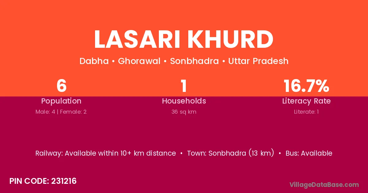 Sonbhadra (13 km) is the nearest town to Lasari Khurd village for major economic activities and is located approximately 13 km away.