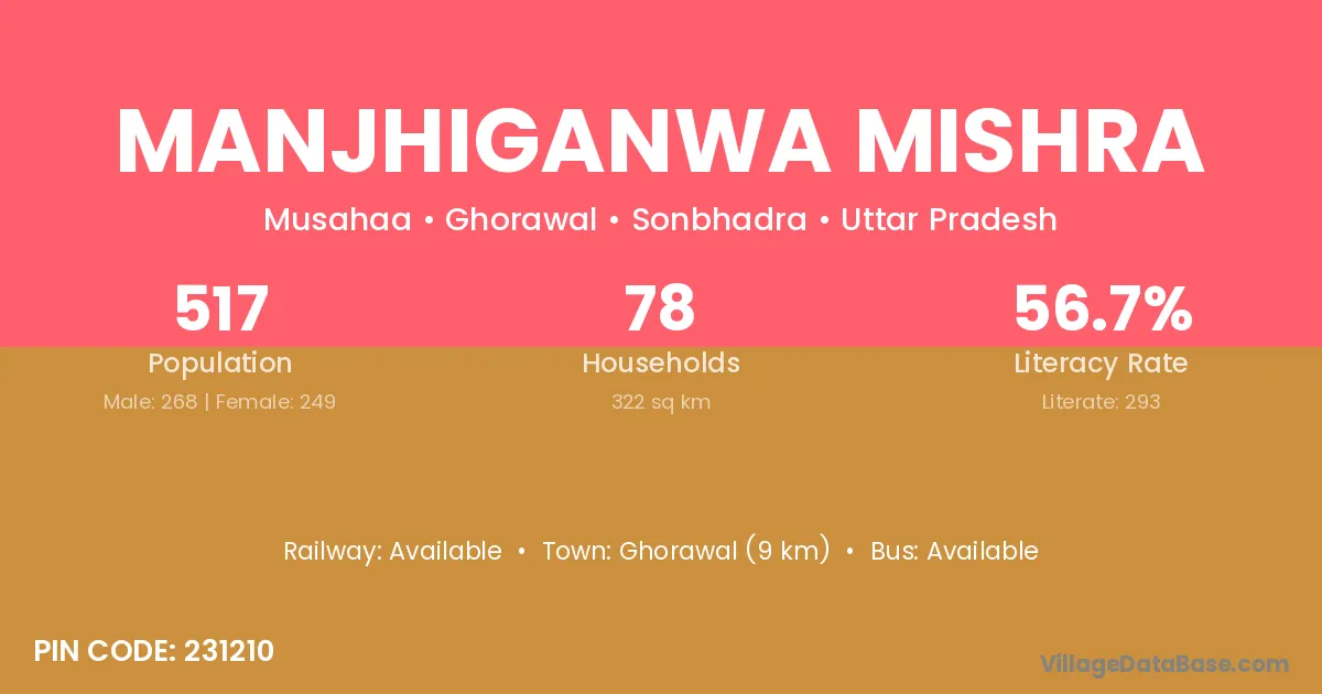 Ghorawal (9 km) is the nearest town to Manjhiganwa Mishra village for major economic activities and is located approximately 9 km away.