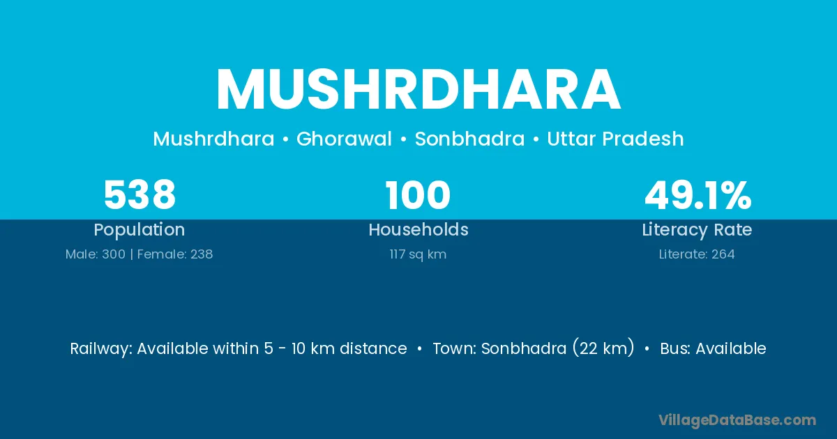 Sonbhadra (22 km) is the nearest town to Mushrdhara village for major economic activities and is located approximately 22 km away.