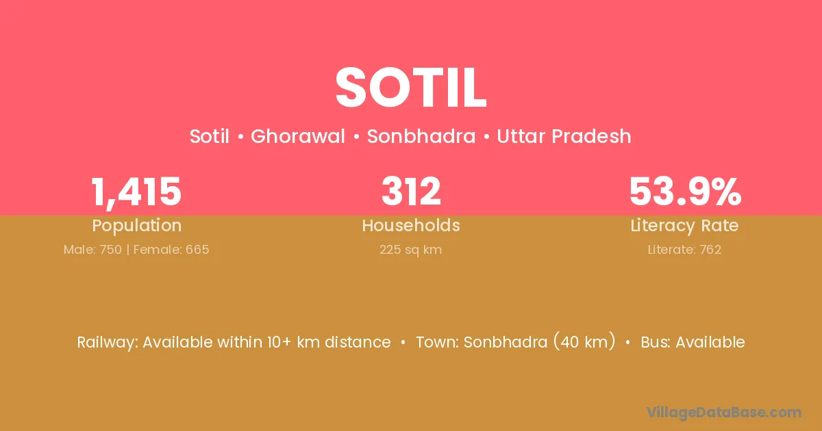 Sonbhadra (40 km) is the nearest town to Sotil village for major economic activities and is located approximately 40 km away.