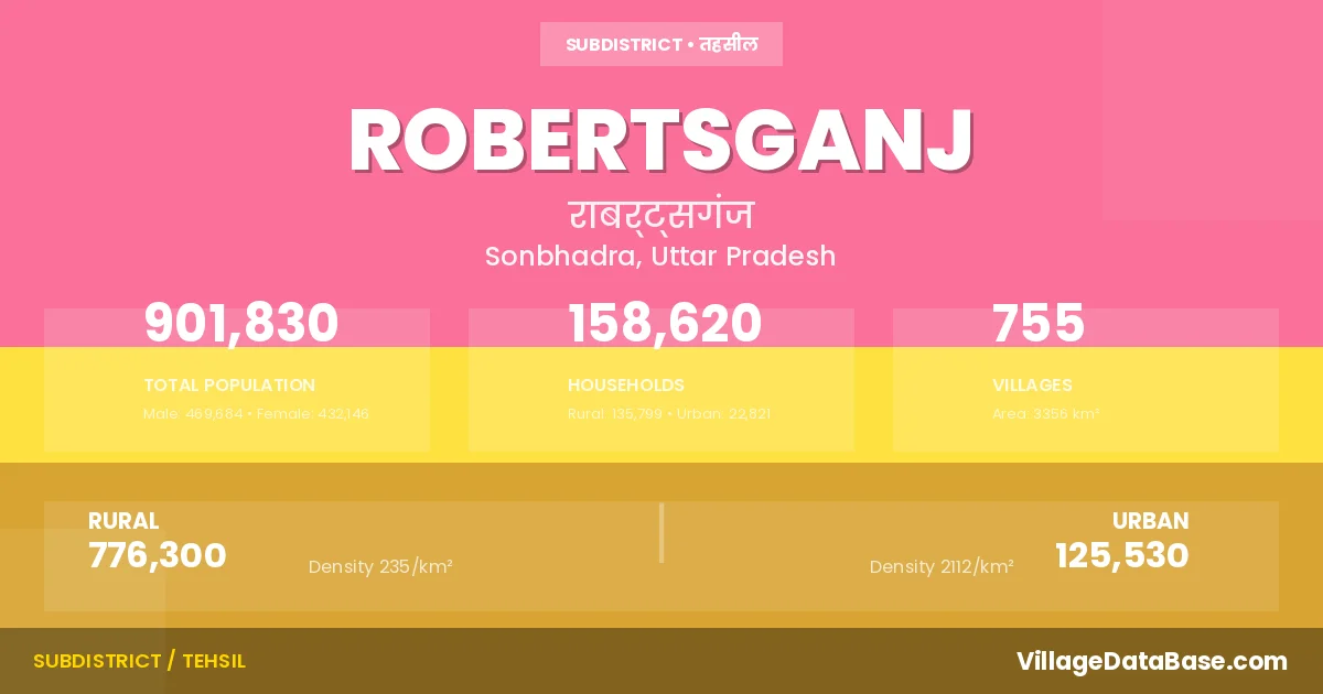 According to the 2011 census The total area of Robertsganj Tehsil is 3356 km², with a population of 901830 people. The population density is 269 inhabitants per square kilometre, and there are approximately 158620 houses in the sub district.