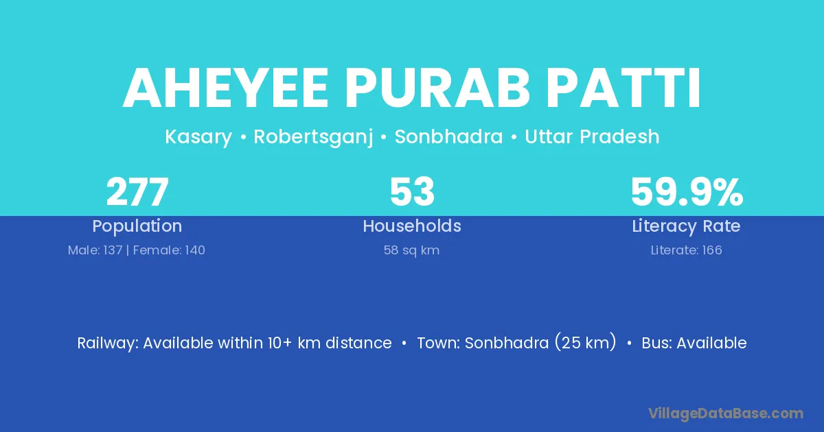 Sonbhadra (25 km) is the nearest town to Aheyee Purab Patti village for major economic activities and is located approximately 25 km away.